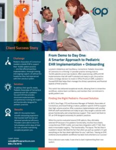 Located in Waterbury and Southbury, Connecticut, Pediatric Associates of Connecticut is a thriving 12-provider practice serving close to 16,000 patients across two locations. After experiencing a difficult EHR implementation that left staff frustrated and ready to quit, the practice made a strategic decision to invest in Office Practicum (OP), a pediatric-focused EHR that helps them manage the clinical, operational, and financial aspects of their practice.